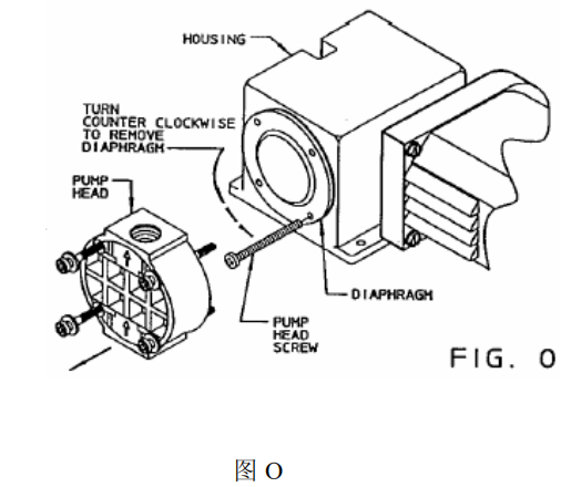 3、 把泵头的一两个螺丝插进隔膜的小孔中逆时针方向旋转取下隔膜。(图 O)
